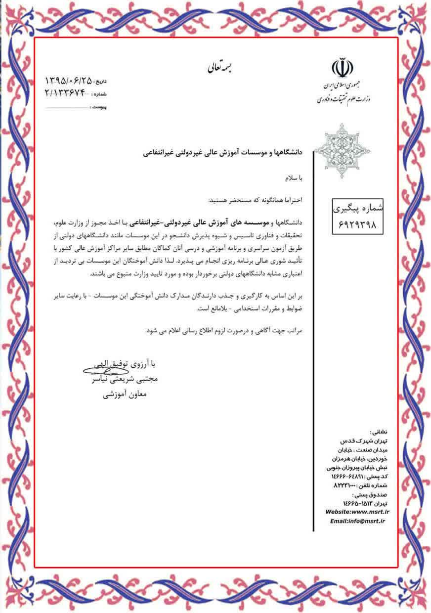 اطلاعیه در خصوص اعتبار مدارک کوسسه های آموزش عالی غیردولتی-غیر انتفاعی