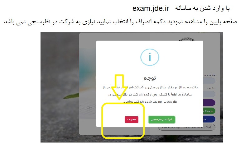 به اطلاع دانشحویان گرامی می رساند برای ورود به سامانه آزمون لطفا حتما حتما از انجام نظر سنجی انصراف بدهید تا در ورود به سامانه مشکل نداشته باشید .